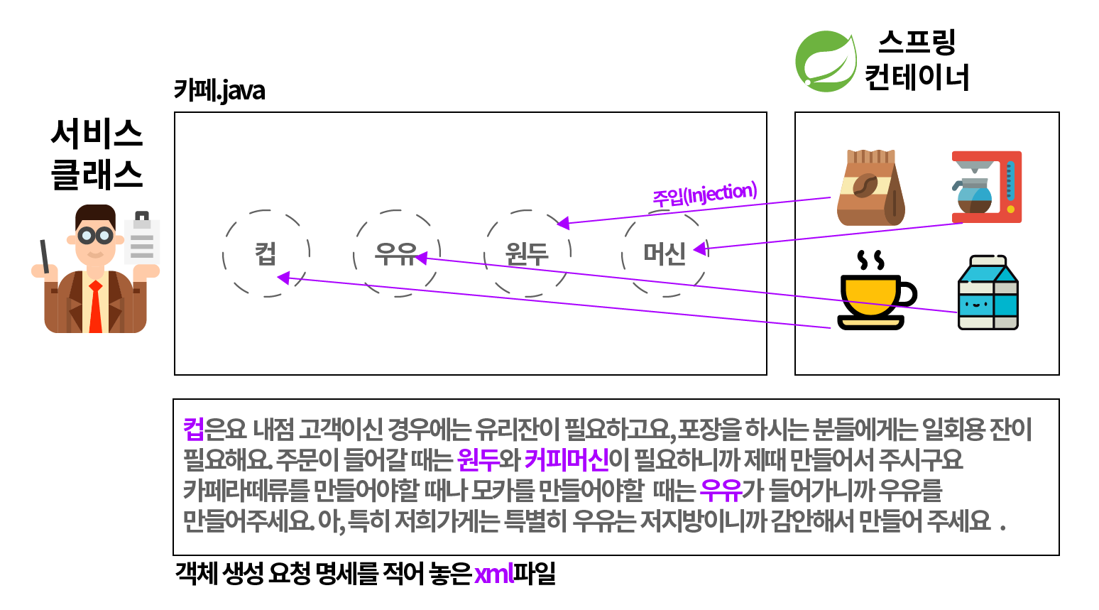 기존 java환경과는 다르게 스프링 컨테이너에게 객체 생성을 맡긴 경우, bean객체를 가져와서 서비스 클래스가 활용할 수 있도록 도와준다.