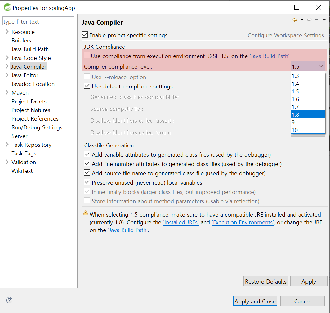 5. 왼쪽 항목 중 Java Compiler를 선택하고 1.8버전을 선택
