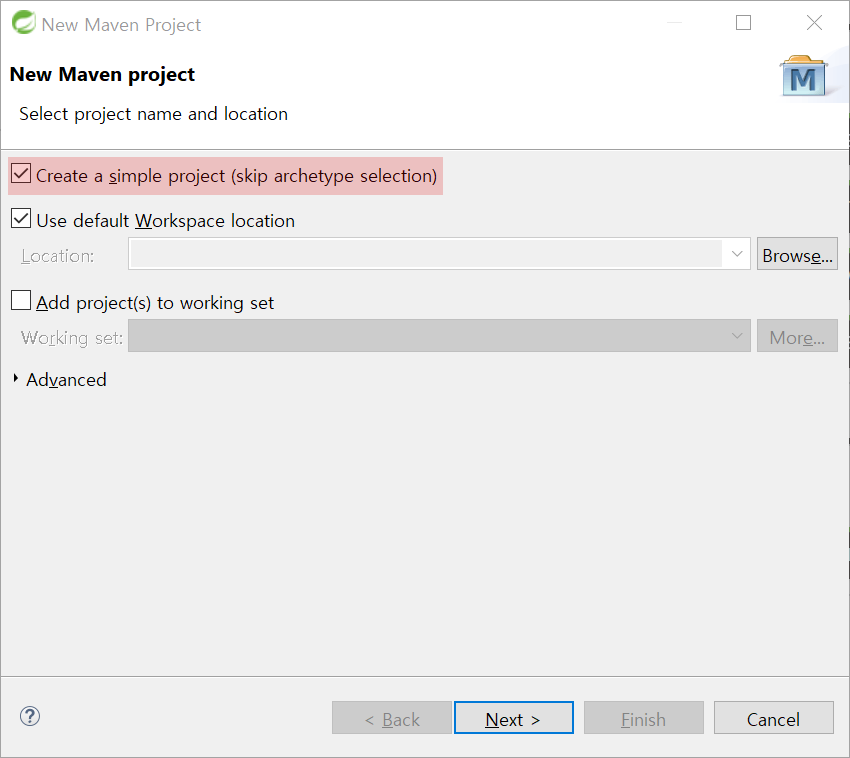 2. Create a simple project(skip archetype selection) 체크 후 Next