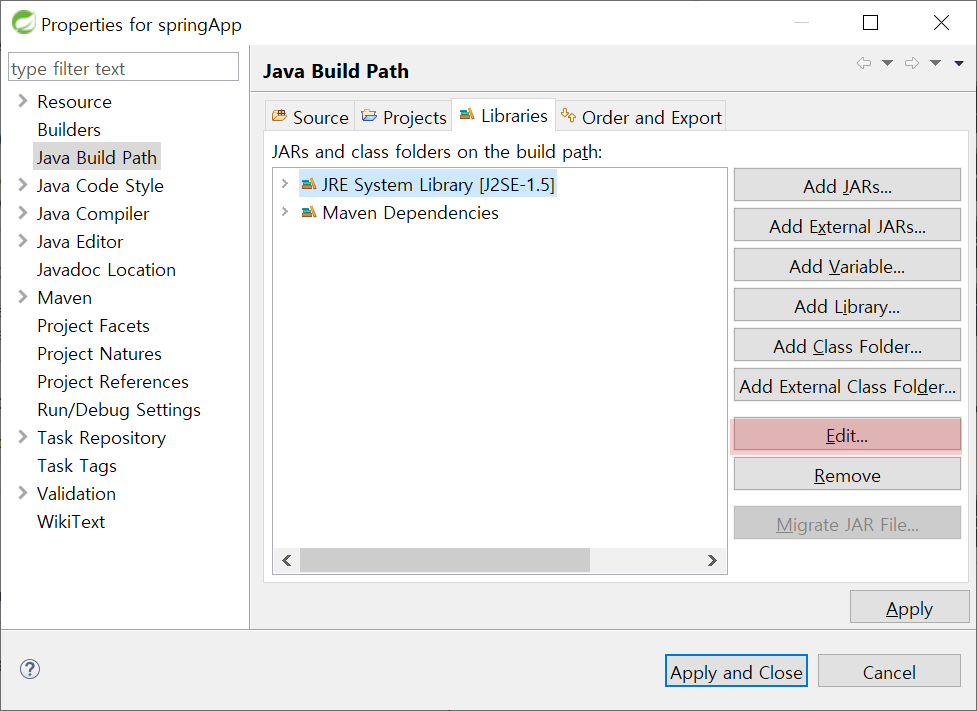 6-1. 왼쪽에서 Java Build Path항목을 클릭하고 우측의 화면에서 Edit버튼을 누릅니다.