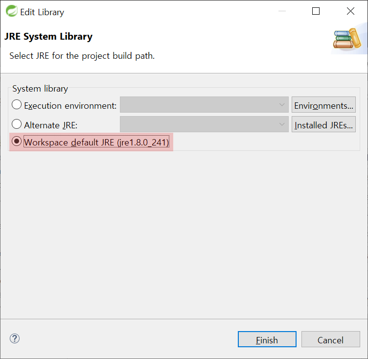 6-2. JRE System Library를 Workspace default JRE (jre1.8.0_241)을 클릭합니다.