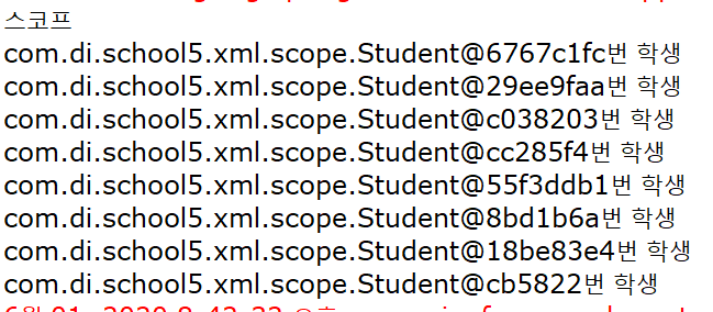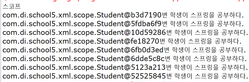 이제는 객체를 참조할 때마다, 즉 getBean메서드를 호출하면서 Student클래스의 객체를 가져올 떄마다 매번 다른 객체를 꺼내 쓰고 있음을 확인할 수 있습니다.