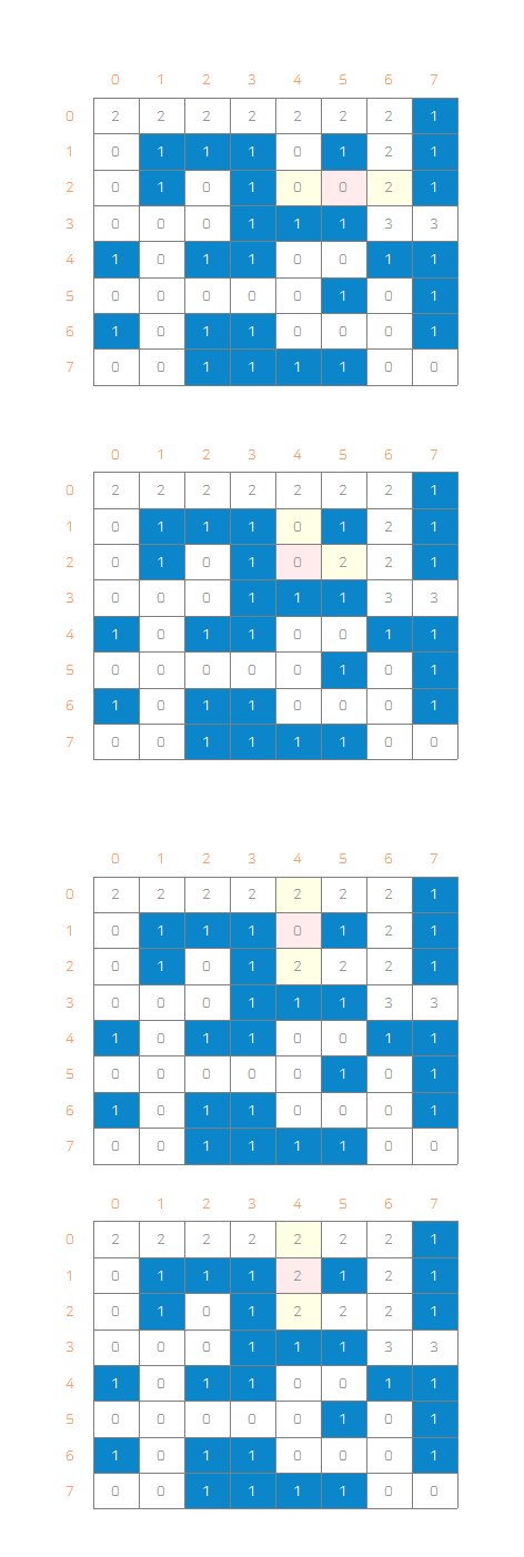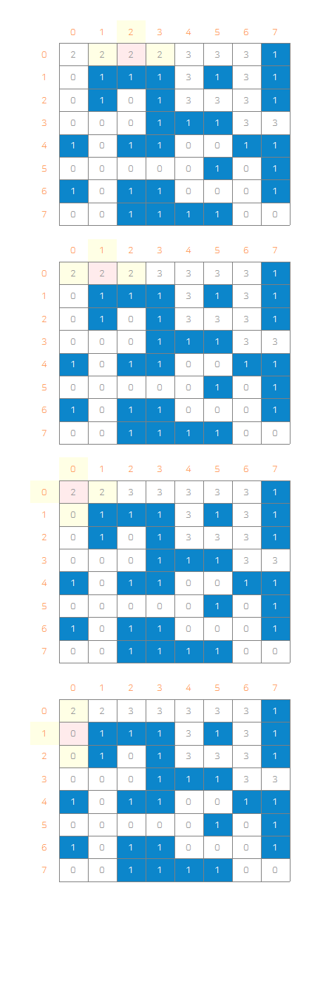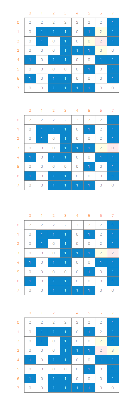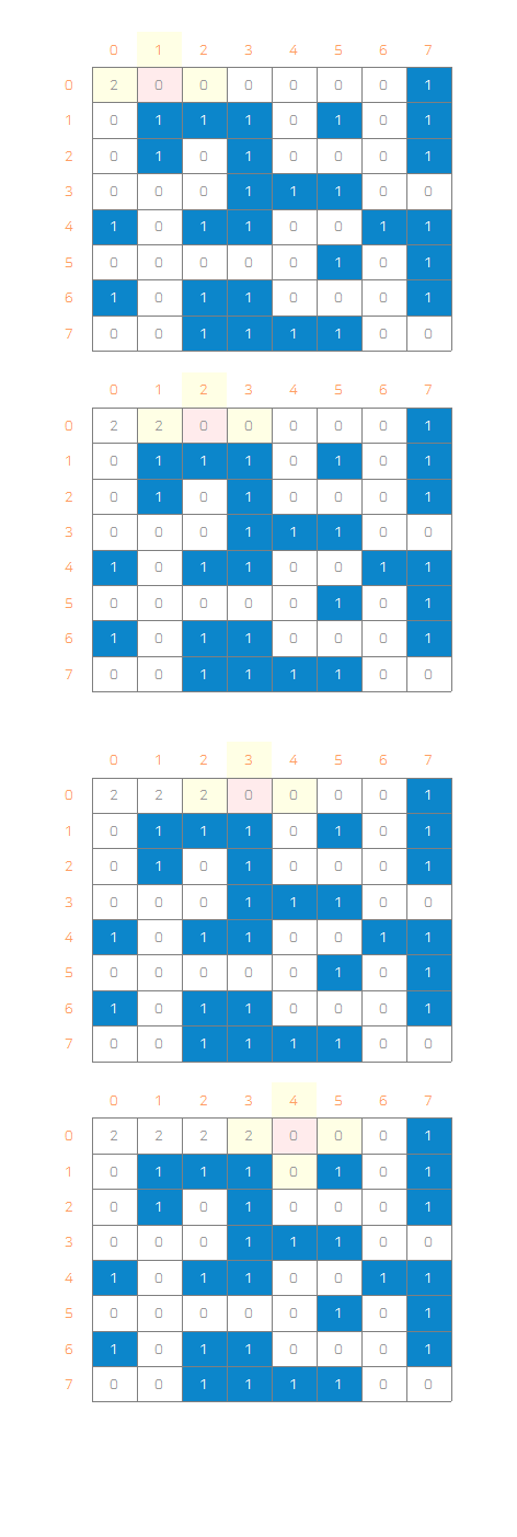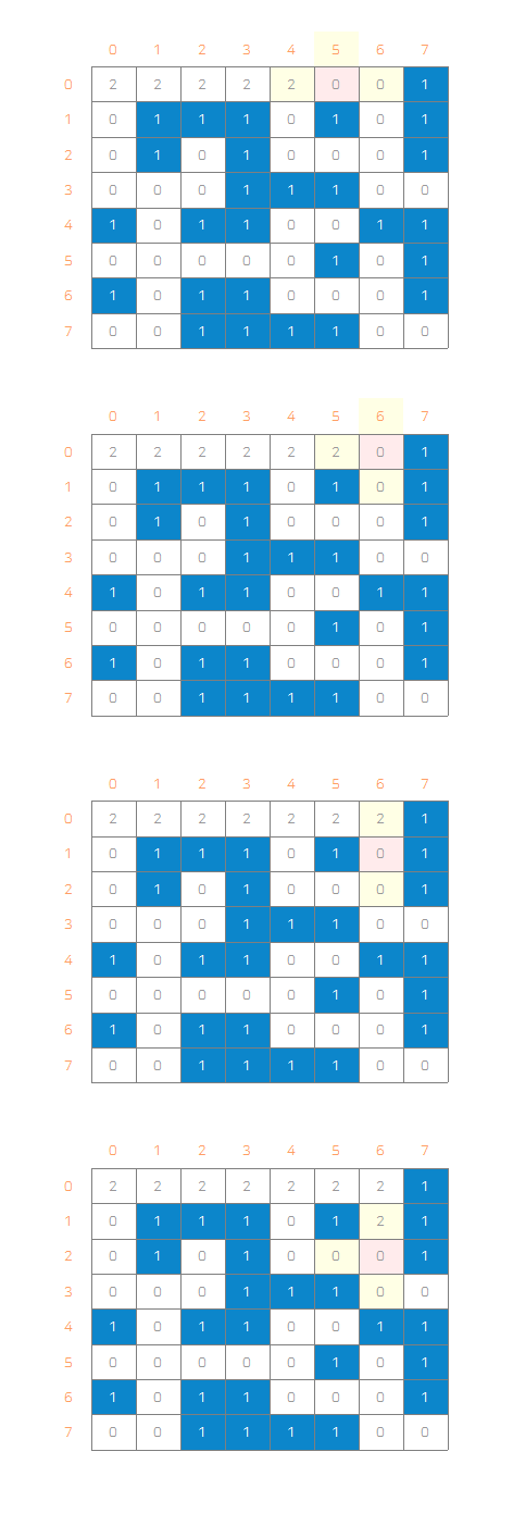 일단 탐색중인 경로를 2라고 하고, 탐색을 다 했는데 막혔다면 3으로 채워나가기로 하였다.