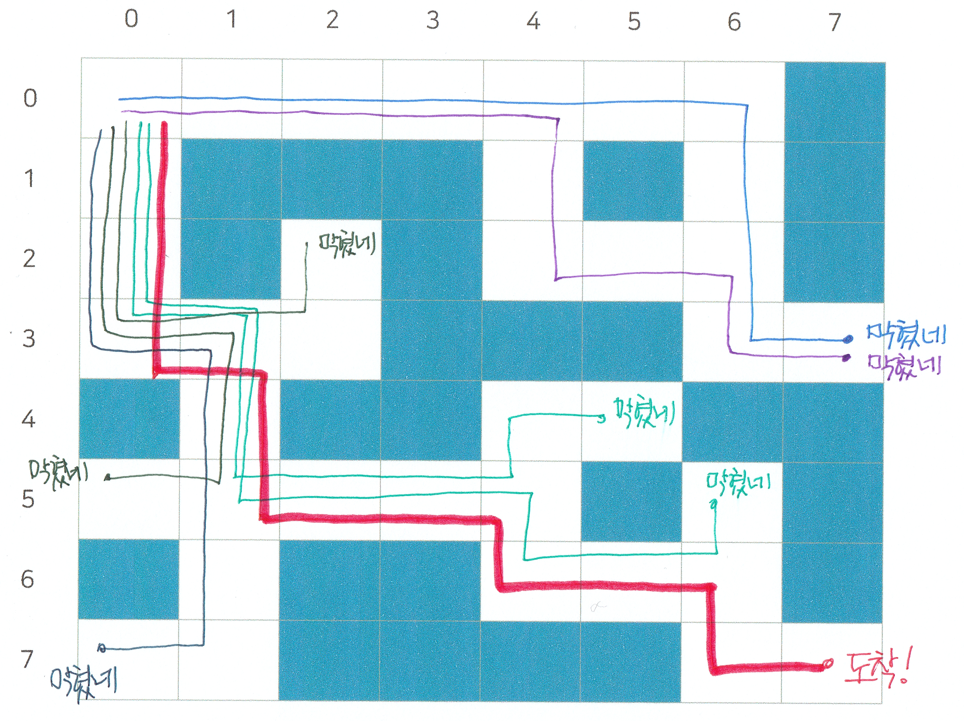 연필로 한 칸 한 칸 긋고 막히는 부분이 있으면 경로를 지우고 새로운 경로를 탐색하지 않을까?